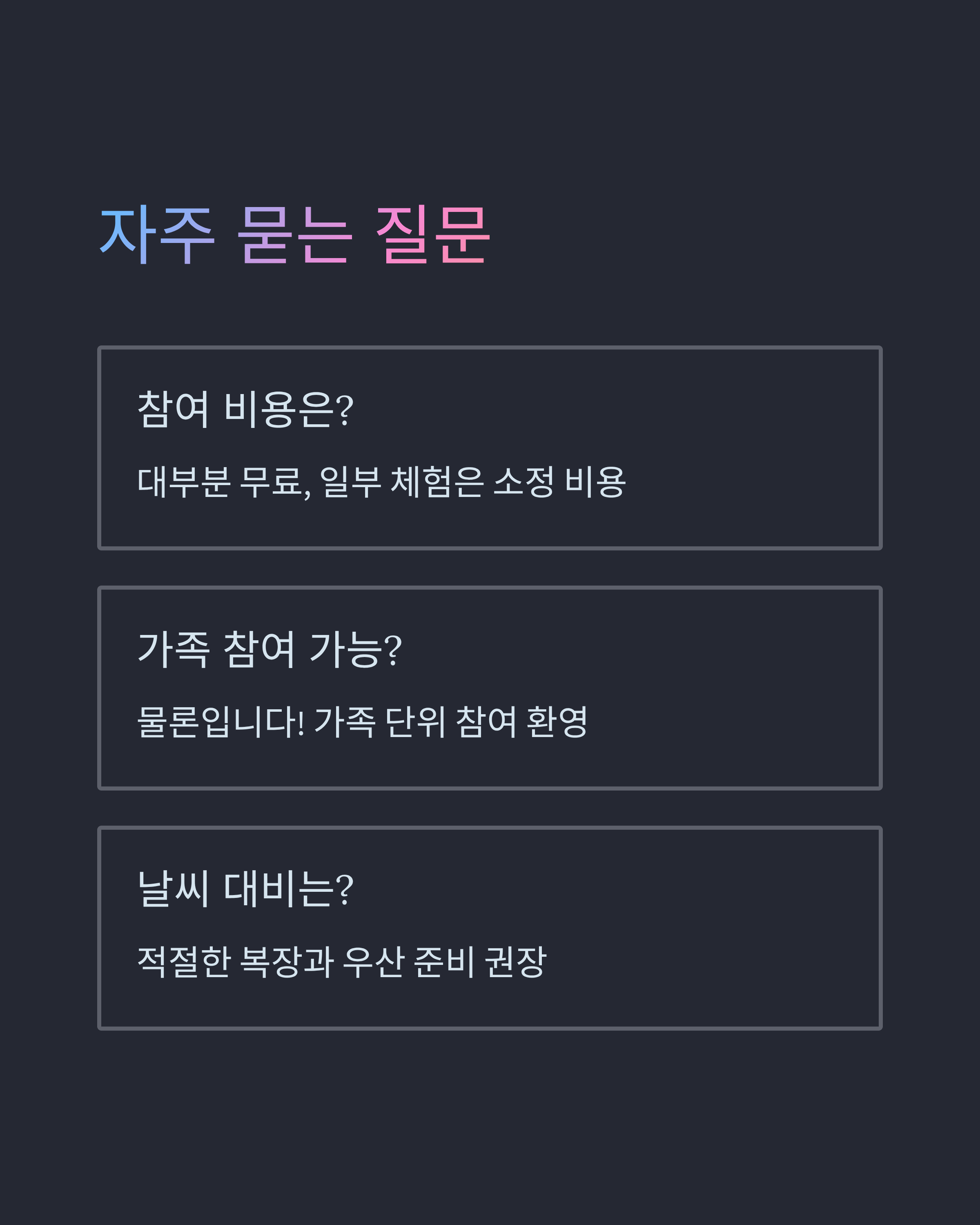 - 참여 비용은 얼마인가요?- 대부분의 프로그램은 무료로 제공되지만, 일부 체험은 소정의 비용이 발생할 수 있습니다.