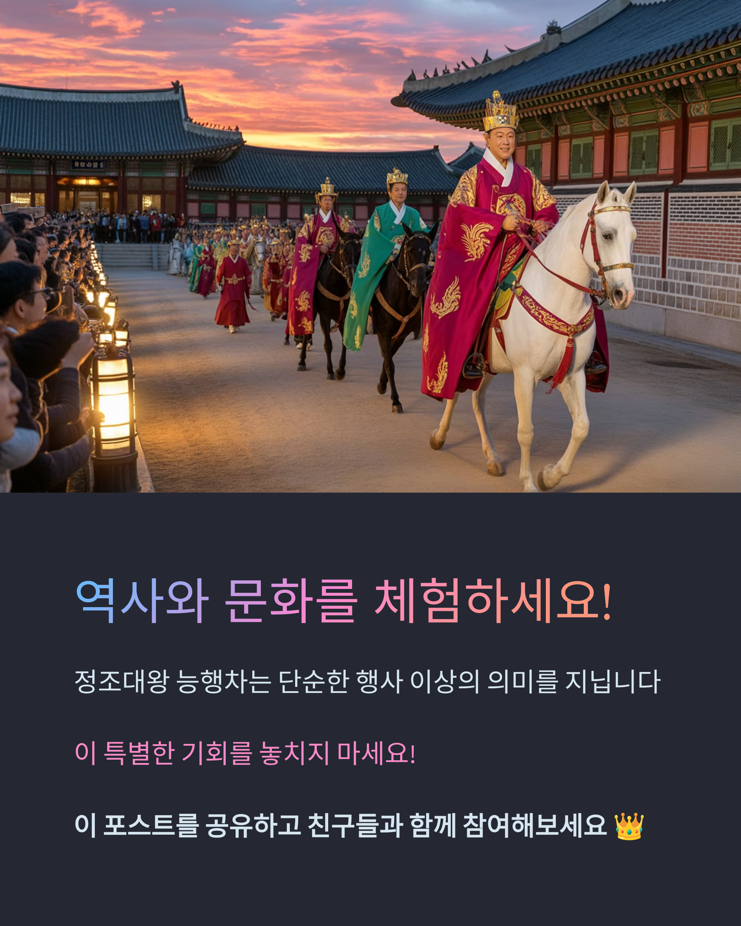 정조대왕은 백성을 사랑하고, 문화와 예술을 중시한 임금으로 알려져 있습니다. 따라서 이번 능행차는 단순한 행사가 아니라, 조선의 역사와 문화를 되새기는 중요한 의미를 지닙니다.